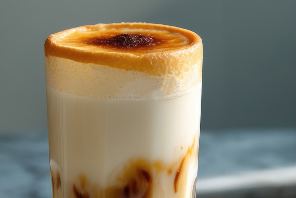 5. Bestrooi de bovenkant met bruine suiker en karamelliseer deze kort met een brander tot een goudbruine, krokante laag. 6. Serveer direct met een lepeltje zodat de gast de gebrande suiker kan breken en genieten van de volle karamelsmaak en zachte espresso