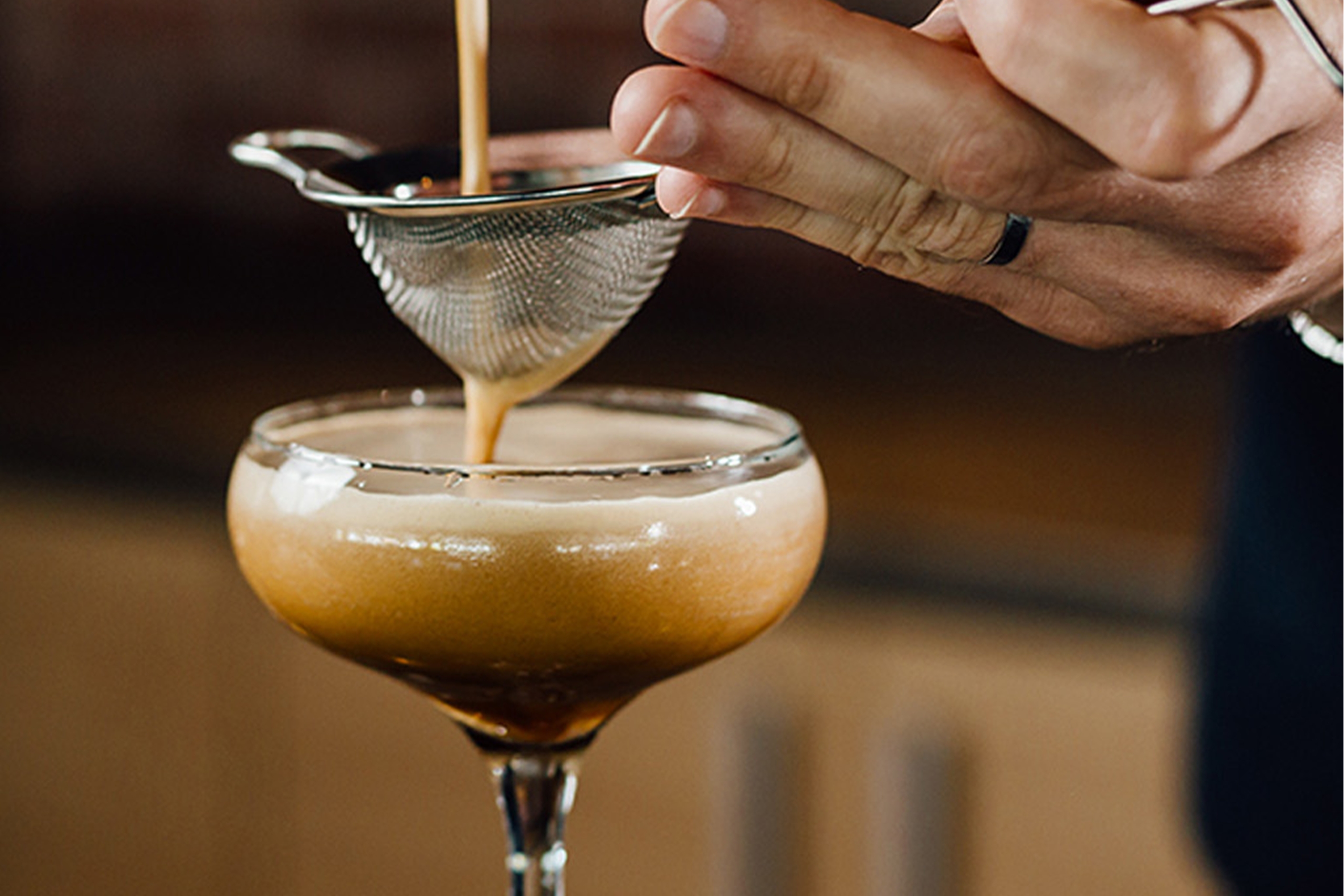 4. Schenk de pumpkin spice espresso martini in de martini glazen.